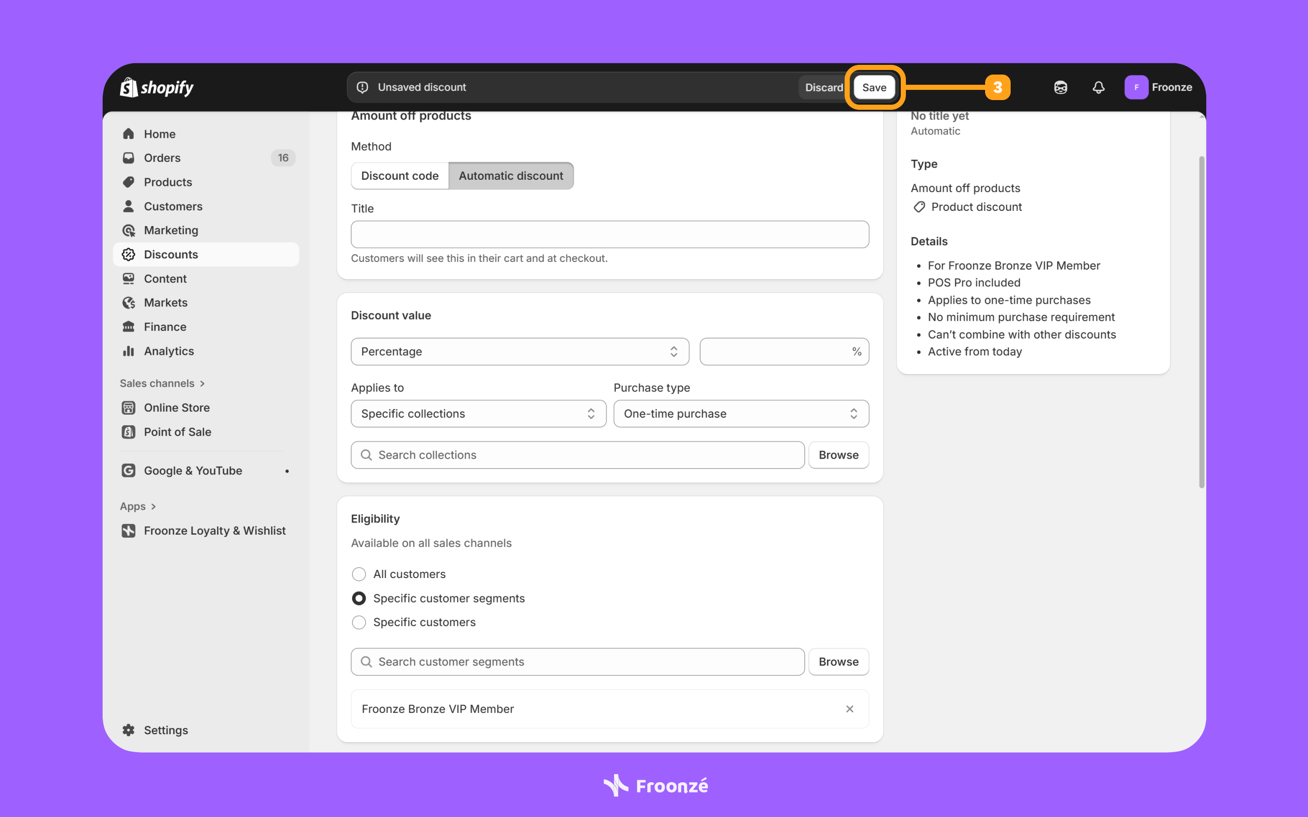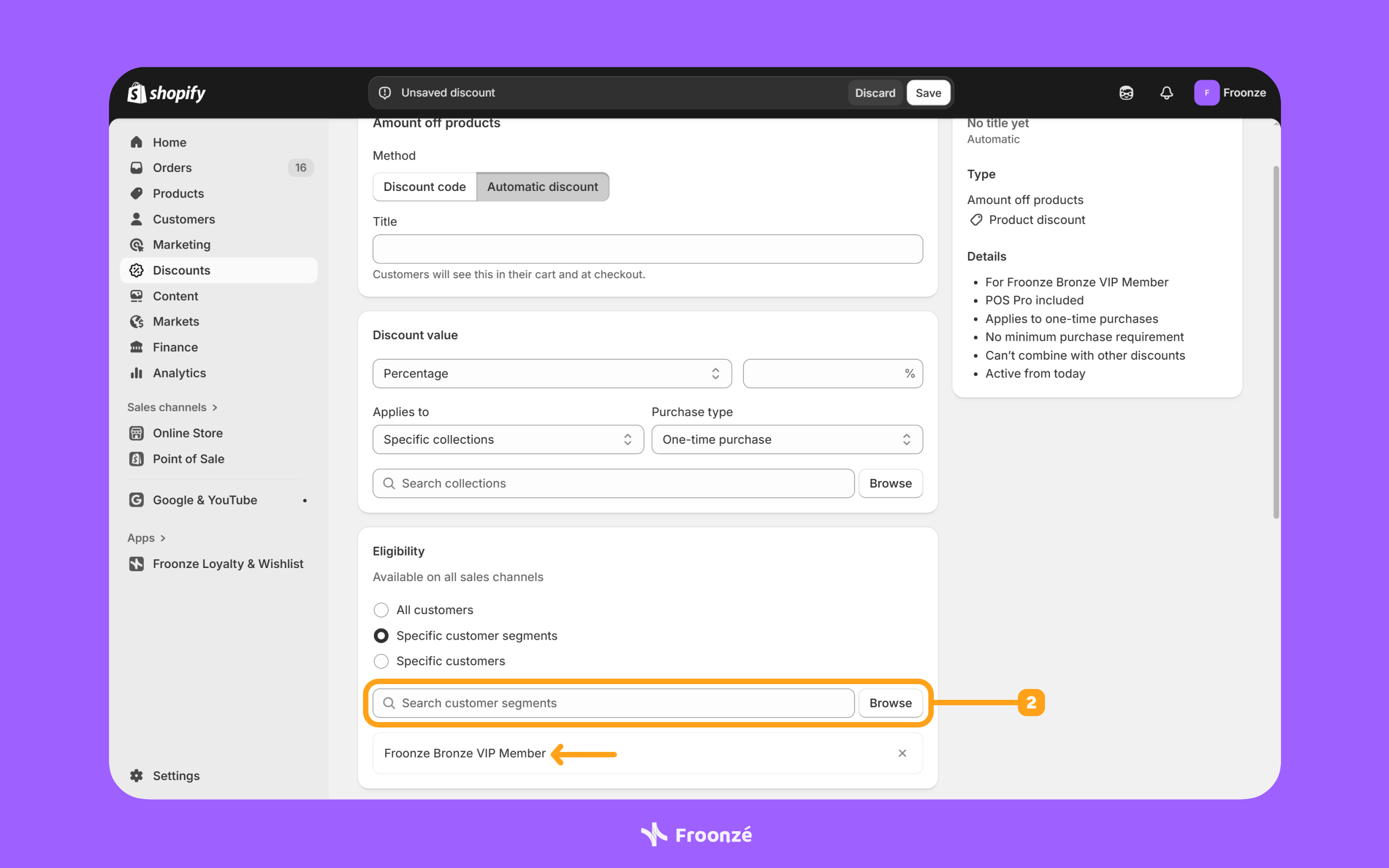 With the new VIP tag-based customer segment created, the next step is to create an ongoing discount.