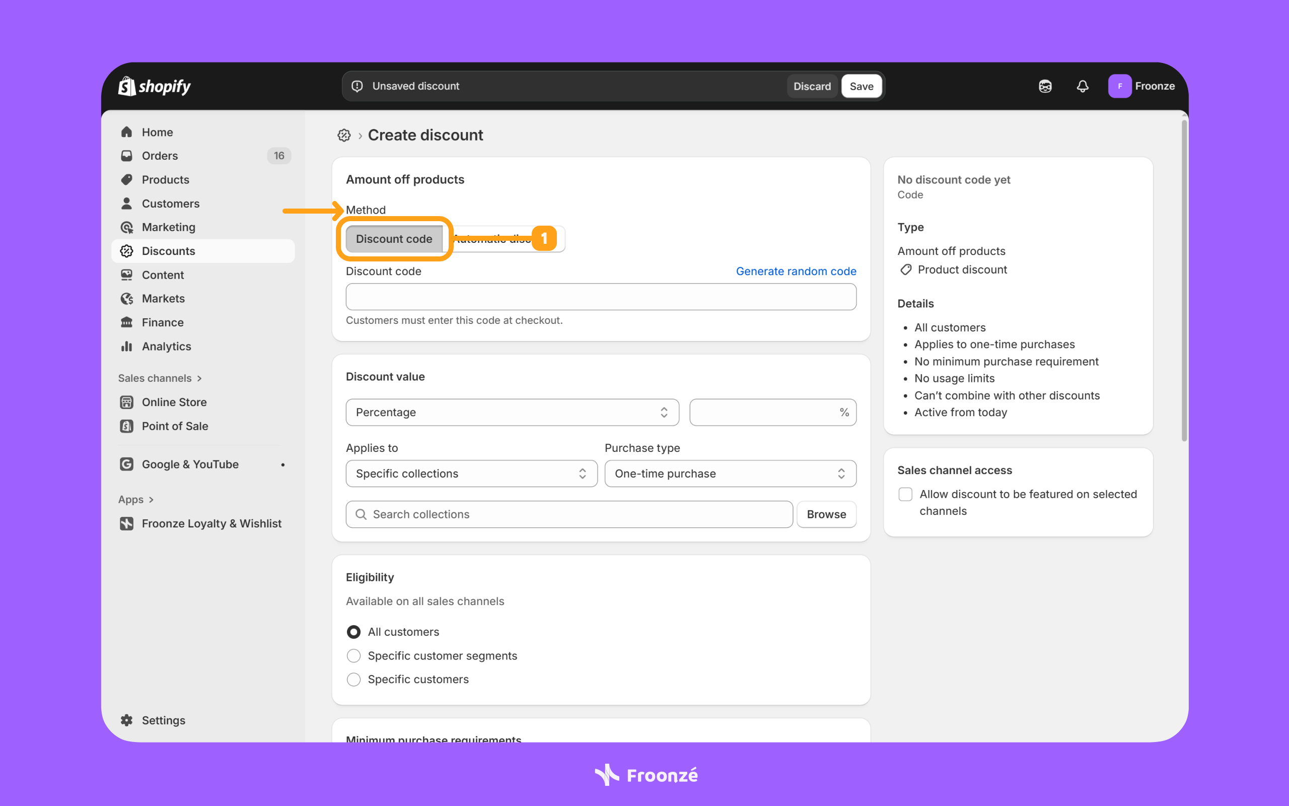 Once in the discount creation page, please refer to the steps in the sections below to configure each discount method.